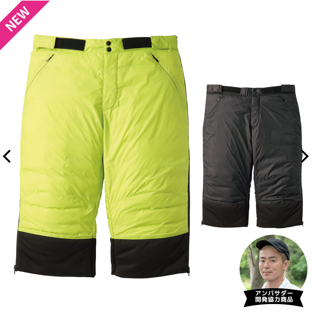 そしてもうひとつは、「リペアテック洗えるフュージョンダウンオーバーショートパンツ」です。寒さに合わせて気軽に着脱できるのは、かなり快適そうです。
